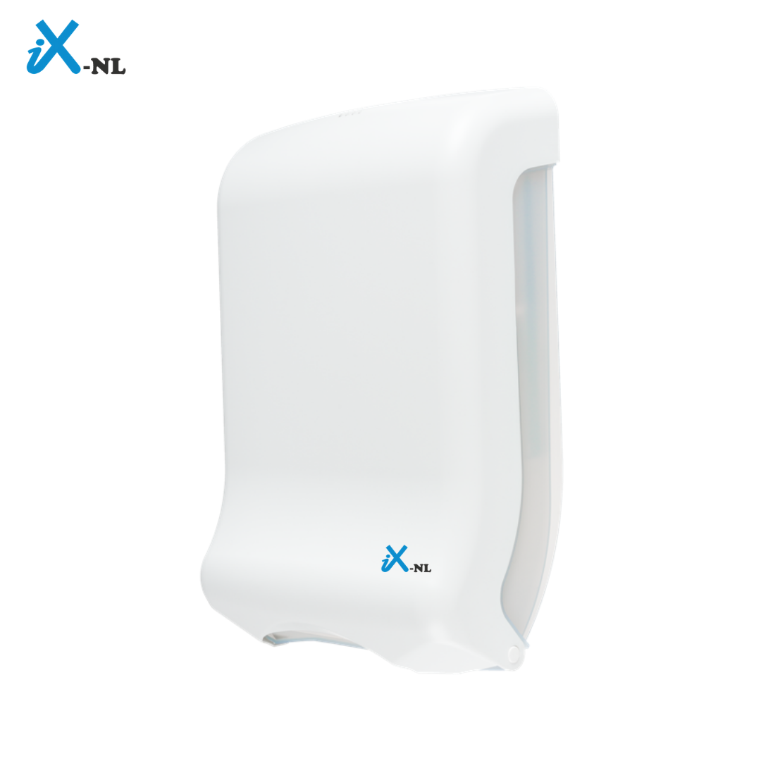OK-Quality vouwhanddoek-dispenser in witte uitvoering voor zowel Z-vouw als Multifold gevouwen handdoekjes, voorzien van aanreikingssysteem